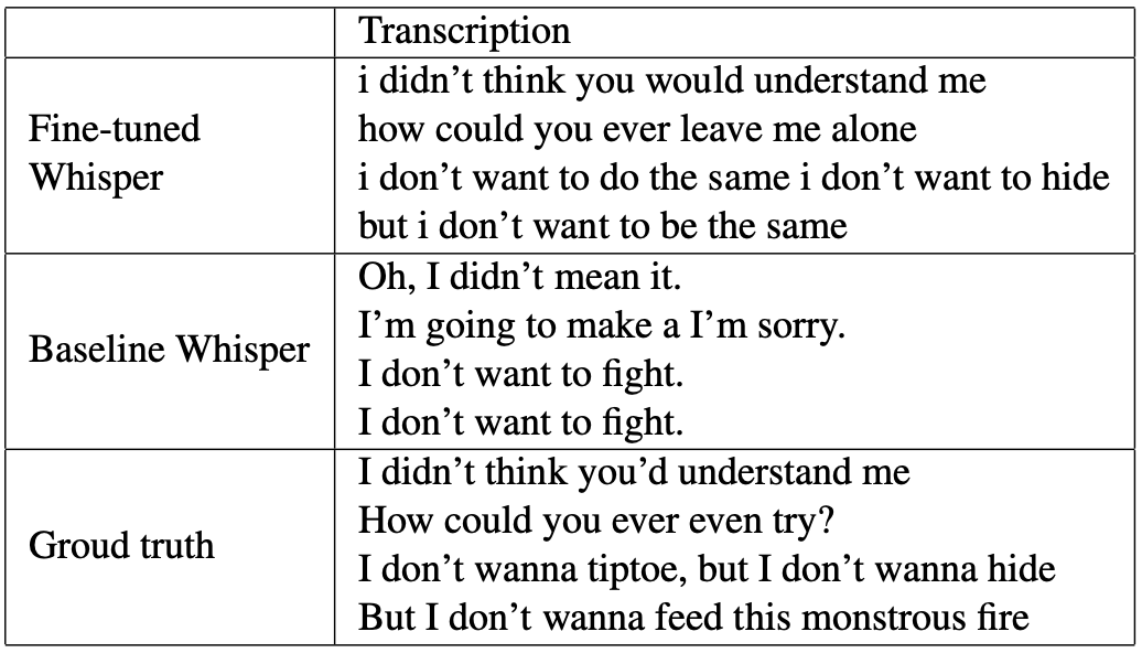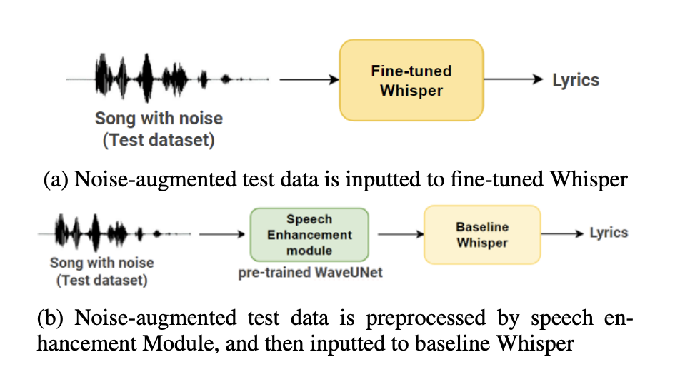 Overall, this project shows that noise-augmented fine-tuning is more reliable than using external Speech Enhancement for lyric transcription. It also opens space for future work: dynamic SNR scheduling, larger Whisper variants, and multi-stage pipelines that combine source separation with noise-robust training.