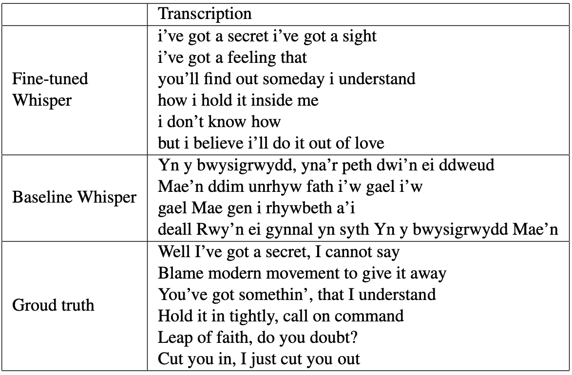 This project explores how to make lyric transcription actually work in noisy, real-world audio — café recordings, concert clips, and phone-captured music. Whisper-medium performs well on clean speech, but it falls apart once background noise enters the signal. To handle this, I fine-tuned Whisper-medium on the JamendoLyrics dataset augmented with MUSAN noise across a range of SNR levels.